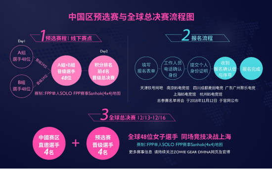 明基(BenQ)宣布ZOWIE GEAR DIVINA 国际女子PUBG邀请赛,中国赛区预选赛将于2018年11月17号至18号于六个城市进行线下赛,预选赛报名时间为北京时间2018年10月 27号中午12点整开放报名,报名截止时间为2018年11月9号中午12点,参赛人数上限为96名,依照报名场馆人数平均分为2个赛区,各48名选手同时开打。