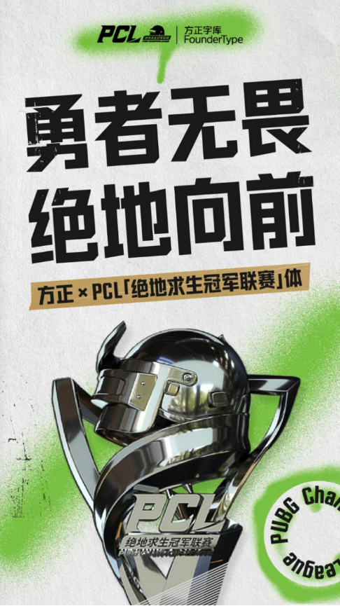 勇者无畏,绝地向前!方正字库与PCL的跨界联动,将字体的根骨与电子竞技勇往直前的精神相融合,打造专属 PCL赛区的字体:字体以黑体为基础,通过字形结构与笔画的调整,整体视觉更加昂扬激烈,端正硬朗,体现电子竞技中团结一致、坚不可摧的团队力量,同时与PCL赛场里热情飞扬的青春风暴完美匹配,展现永不言败、誓夺第一的PCL赛区精神,助力PCL赛区各战队乘风破浪!