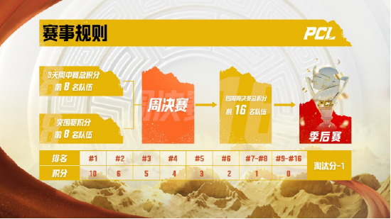 夏季赛决出的16 支战队将进行为期5日的季后赛,每日 6 场,根据“积分赛制”, 季后赛结束后分数最高的队伍将获得夏季赛总冠军荣誉,同时,季后赛排名前八的战队将获得通往 PCS7东亚洲际赛的门票。值得注意的是,今年夏季赛冠军队伍是无法直接拿到PGC世界赛名额的,因此PCS7将会是各路豪杰争夺PGC关键积分的主力场。