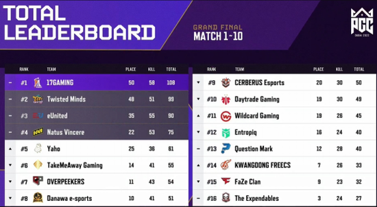 第七局,TMA战队拿下房区闯进决赛圈,随着最后阶段的缩圈,eU战队选择不给分,而后TMA战队和EIQ战队不断狙击Twis战队致使对方仅剩一人,EIQ战队在蓝圈的逼迫下被TMA战队淘汰,最后时刻TMA战队二打一Twis战队,无奈蓝圈逼近加上燃烧瓶限制空间,TMA战队被Twis战队独狼一穿二憾失首鸡。第八局七阶段,TMA战队在圈边小坡下惨遭DNW战队的围攻,被团灭出局;而17战队则是在本局凭借淘汰数重回榜单第一。第十局,17战队双人组闯进决赛圈,在Yaho战队扶人之际用一颗手雷淘汰对方,但随后由于自己暴露在对方的视野下,也被对方用手雷击倒一人,仅剩一人的17战队选择不给分。至此,17战队再度保住了榜首的位置,TMA战队冲至榜单第六。